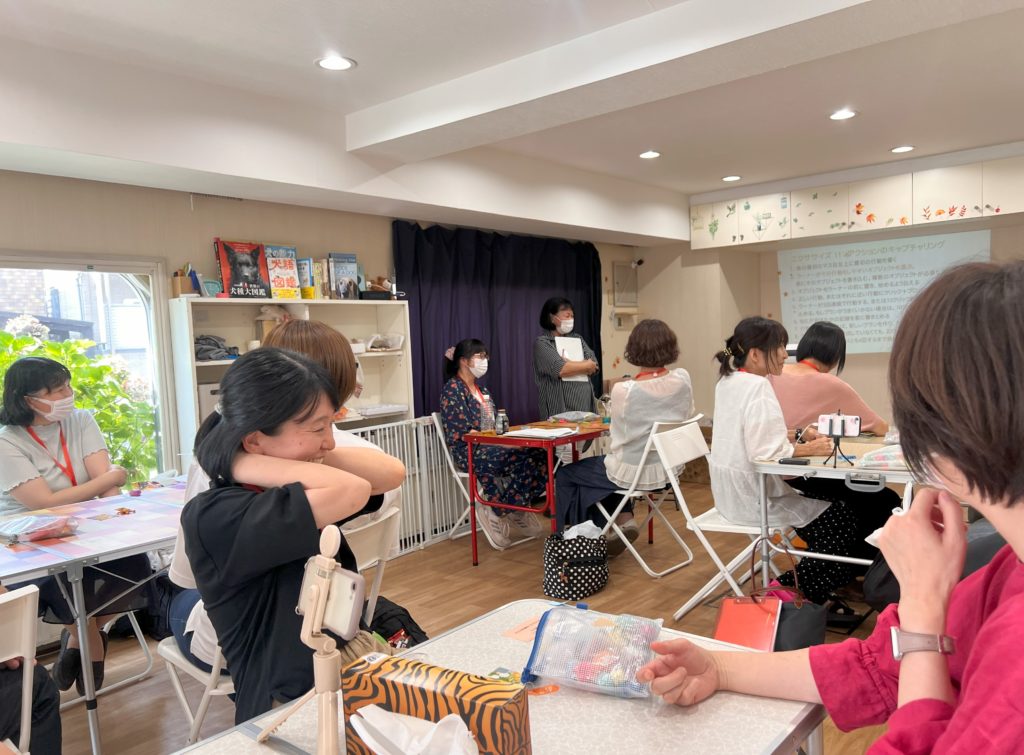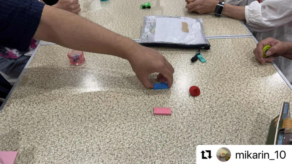 出されたお題に対して、ティーチャー役の人はどうやったらラーナー役の人がエラーレスに進められるか、最終行動を作るために、どの行動と、どの行動が必要かなど細かくトレーニングステップを組み立ててからスタートします。一番ここが難しいところです。途中でラーナーとティーチャー役が入れ替わることにも大きな意味がありました。ラーナー役の人が持っている行動レパートリーや、出やすい行動など、教えながらも観察しながらステップを細かく調整する必要があるからです。